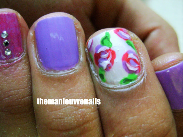 MIDDLE FINGER- I used 3 coats of Nail Trend Pearl White as the base. On that, I painted the roses using Nail Trend Cherry Red, OPI Do You Lilac It?, and white acrylic paint. The leaves were done using Nail Trend Fresh Green and details using dark green acrylic paint.